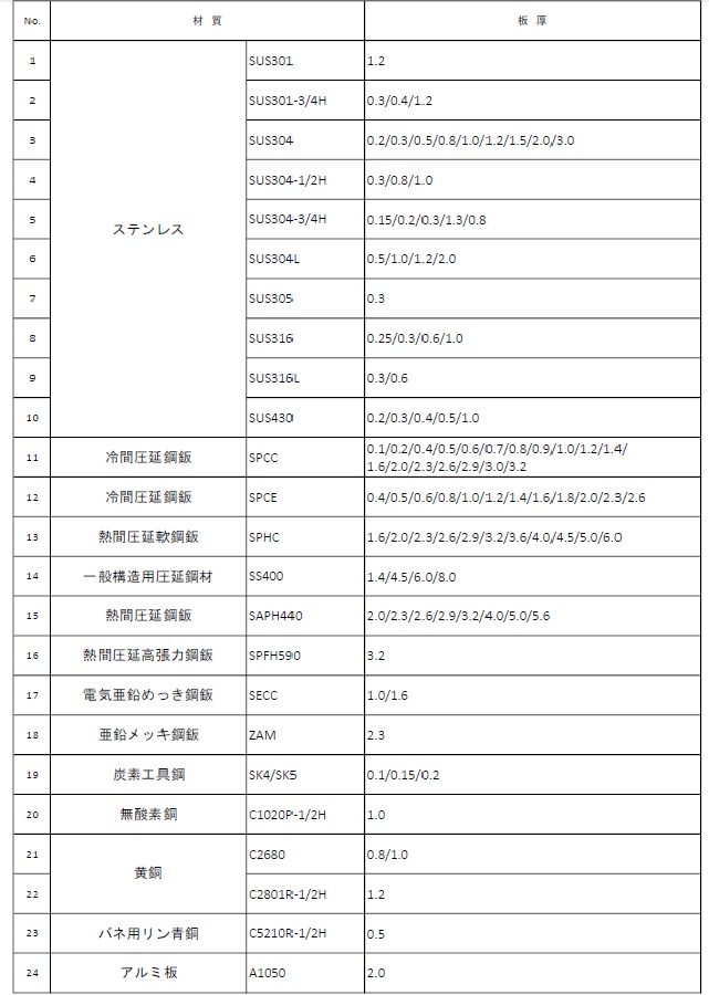 今回はみなさまによりご理解いただけますよう、加工実績のある材料をリスト化しました。ぜひご覧いただき業務にお役立ていただければ幸いです。