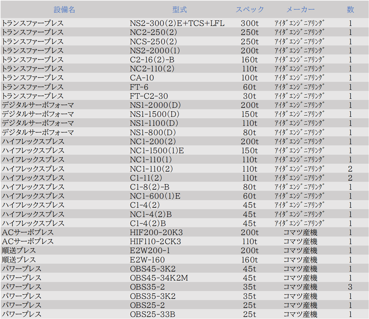 今回はみなさまに弊社所有のプレス機を認知していただけますよう、一覧のリストに致しました。ぜひご覧いただき、ご参考にしていただければ幸いです。