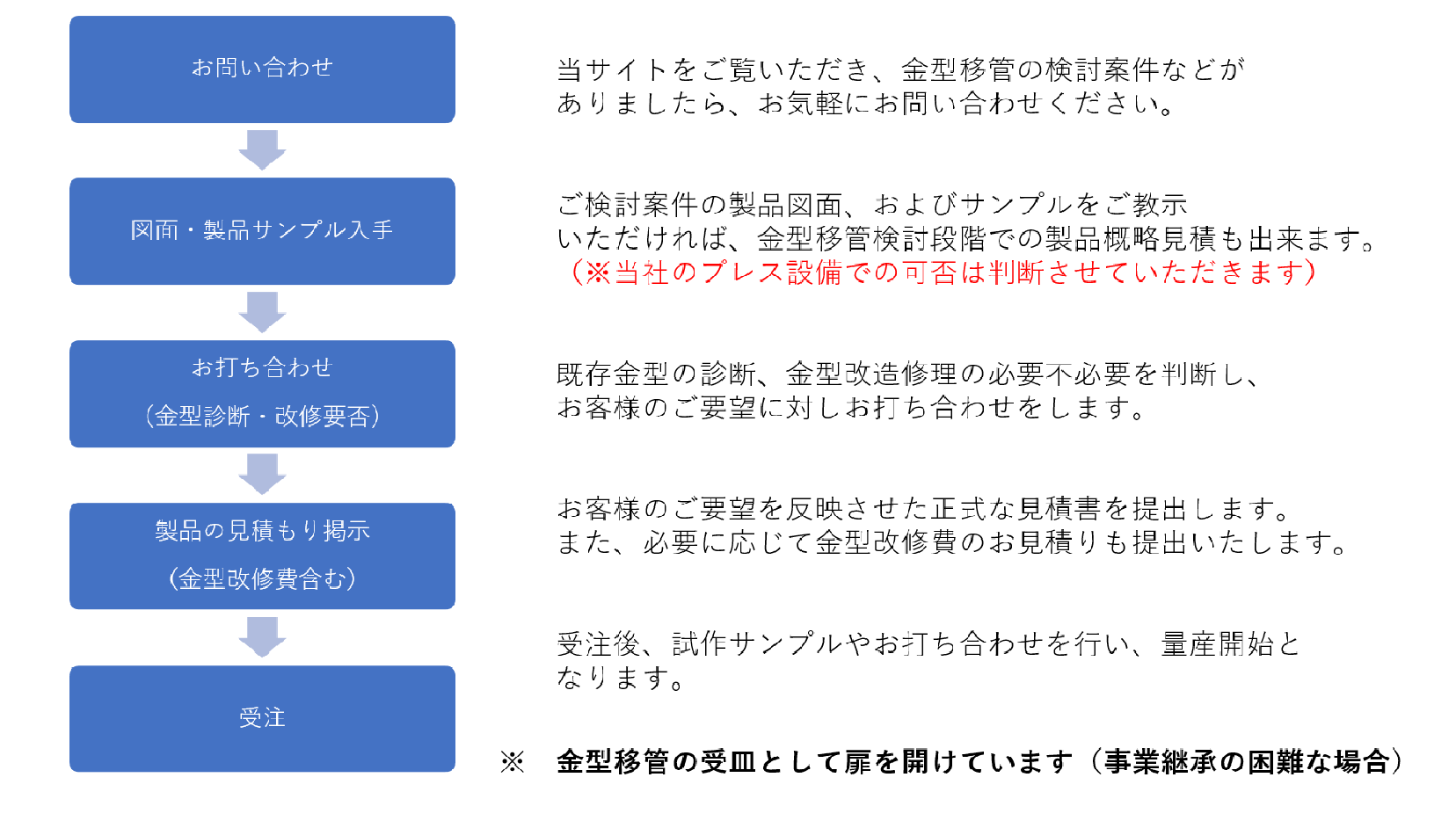 金型の条件や設備との兼ね合いなど、すべての金型移管に対応できるわけではありませんが、